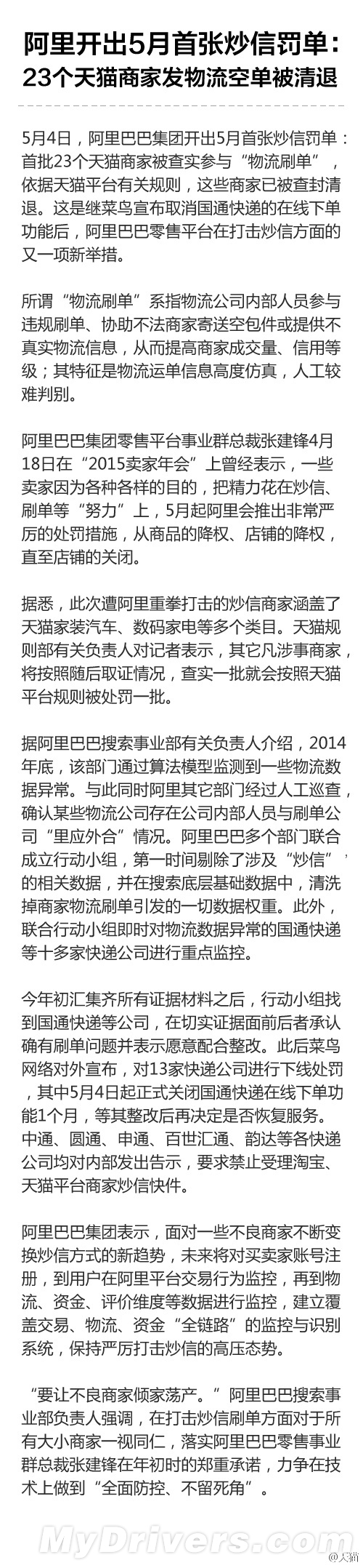 据了解,这是继菜鸟宣布取消国通快递的在线下单功能后,阿里巴巴零售平台在打击炒信方面的又一项新举措。